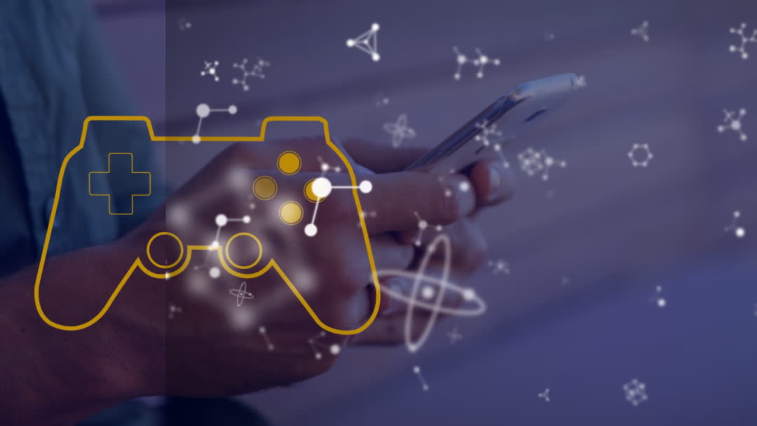 This modern concept video integrates smartphone usage with digital molecular graphics and gaming components. The futuristic visuals demonstrate interconnectedness in technology, suitable for illustrating concepts of digital innovation, global connectivity, and advances in mobile interfaces.