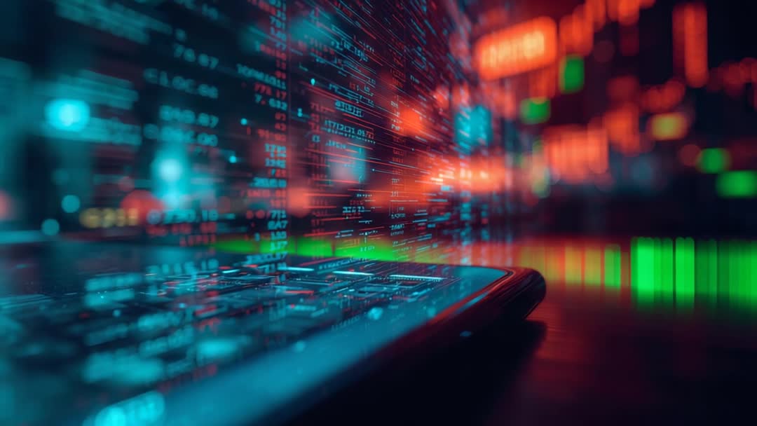 - Smartphone Streaming Live Market Data with Neon Tickers and Reflective Desk Bokeh