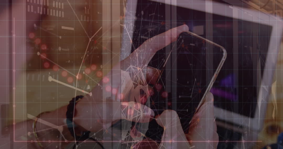 Visual of hands using a smartphone with a transparent layer displaying digital and financial data. Suitable for articles or presentations focusing on technology in finance, mobile device trends, digital innovation, business strategies, or global communication impacts.