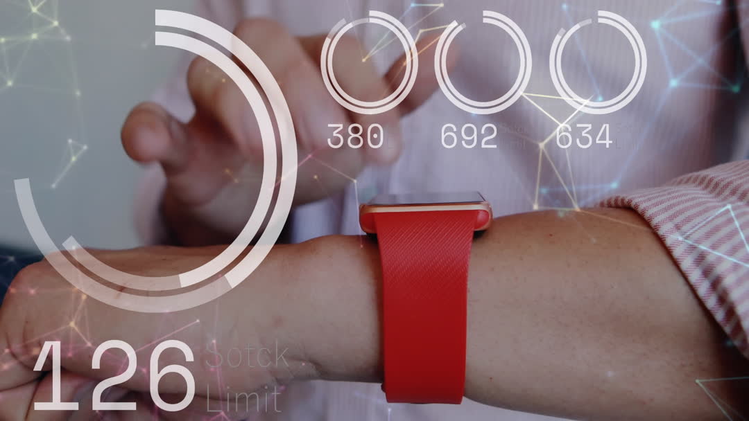 Person interacting with smartwatch showcasing digital data visualization. Useful for illustrating modern technology usage, business analytics, wearable tech advancements, or showcasing digital products. Ideal for content on business technology solutions, digital interfaces, and tech innovation.