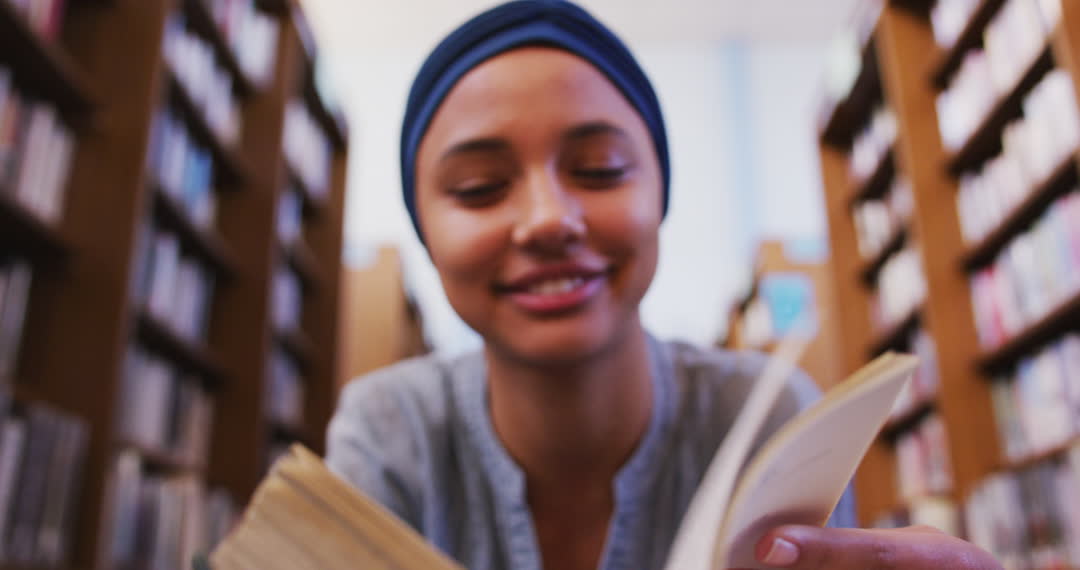 Young Asian woman wearing blue hijab is flicking through book while studying in library. Her expression suggests enjoyment and focus, making the scene ideal for illustrating multicultural educational themes. Useful for promoting literacy, study programs, diverse representation in education, or library resources.