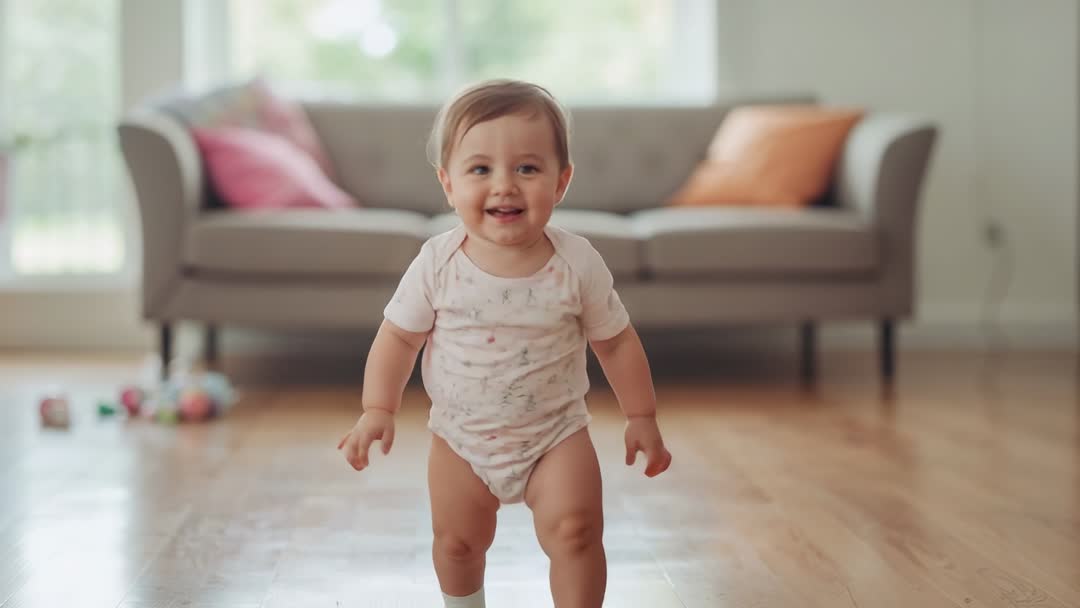 AI Generated Video. Clip showing smiling baby cruising across sunlit living room toward camera. Baby wearing patterned onesie and taking steady first steps across hardwood floor while maintaining joyful expression. Background featuring gray sofa with colorful cushions and scattered toys near large window, producing soft natural light and warm atmosphere. Camera framing focusing on movement and facial expression, creating candid family milestone moment. Ideal for parenting content, childcare articles, family lifestyle campaigns, baby product commercials, and social media reels. Suggested uses include B-roll for brand videos, hero clip for parenting blog headers, footage for pediatric or early development presentations, promotional spots for baby clothing and safety gear, and emotional storytelling in family advertising.