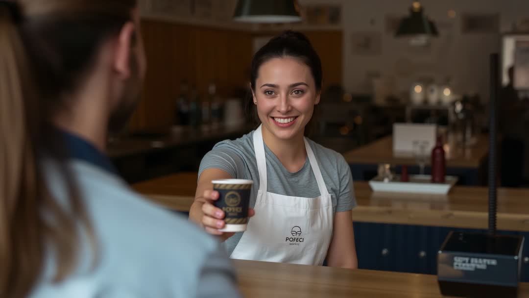 AI Generated Image. Video clip capturing smiling barista handing takeaway coffee cup to customer across wooden counter in cozy café interior. Barista wearing white apron and gray shirt, reaching forward with cup while maintaining eye contact and warm smile. Customer appearing in foreground out of focus, adding depth and sense of personal interaction. Warm ambient lighting highlighting wood counters, coffee equipment, and counter display. Footage working well for promoting coffee shop service, hospitality campaigns, barista training, social media ads, website hero banners, blog articles about morning routines, and small business marketing. Clip allowing close-up cropping for product shots, widescreen framing for commercials, or square crops for social posts. Color grading and caption overlay recommending for use in promotional reels, point-of-sale displays, and instructional videos about customer service.