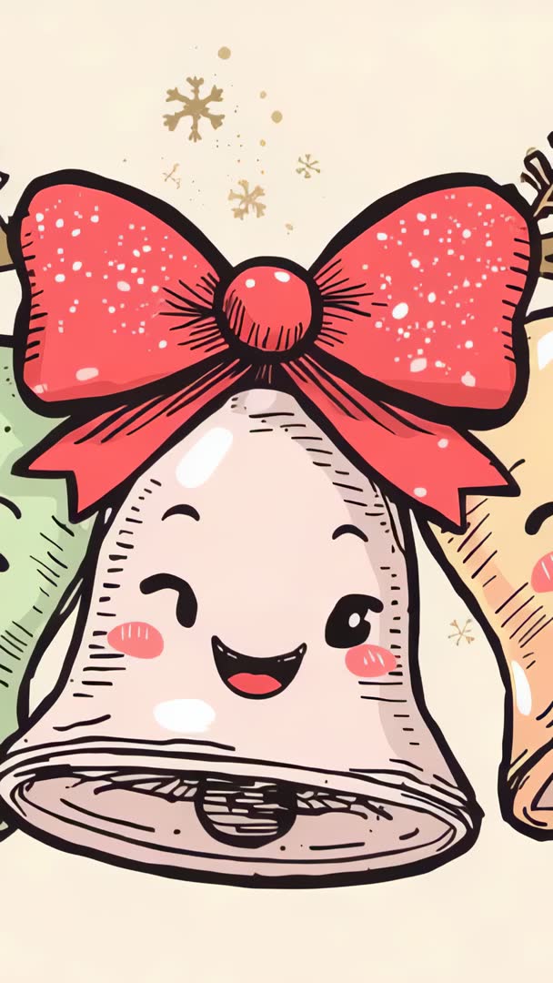 AI Generated Video. Featuring smiling bell character wearing red bow and rosy cheeks, blinking and bobbing on greeting card background with gold snowflake accents. Vertical looping clip optimized for mobile stories, reels, and holiday ads, delivering quick repeatable motion for attention-grabbing content. Perfect for sharing on social media stories, adding to holiday email campaigns, animating greeting card intros, decorating mobile app banners, creating festive stickers, and enhancing children's seasonal projects. Style combining hand-drawn line art, soft pastel palette, and kawaii charm, producing cheerful and playful holiday mood.