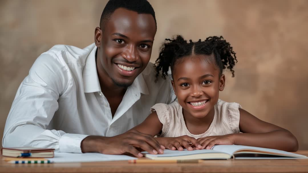 AI Generated Image. Showing warm moment between Black father and young daughter leaning over open book on wooden table. Camera capturing close-up smiles, hands resting on pages, pencils and notebook at foreground. Conveying trust, engagement, joyful learning, and strong parent child bond. Useful for promoting family literacy programs, parenting blogs, educational apps, homeschooling resources, tutoring services, school marketing, fatherhood campaigns, corporate diversity materials, social media ads, and newsletter headers. Working well for warm hero video, testimonial sequence, background B-roll for education stories, or stock clip for commercials highlighting family support and early childhood learning.