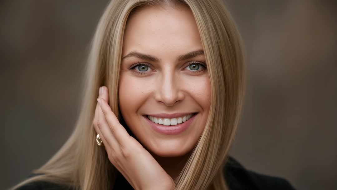 AI Generated Video. Video showing close-up headshot of smiling blonde woman touching cheek with left ringed hand, warm diffused lighting and soft neutral background. Featuring natural makeup, straight hair, even skin tone and bright smile, conveying warmth, approachability and confident charm. Suiting beauty and skincare campaigns, dental and cosmetic dentistry promotions, jewelry advertising, lifestyle and wellness content, corporate about or team videos, social media profile clips and casting reels. Usage ideas: cropping for vertical mobile formats, looping short segment for brand intros, adding soft color grade to match brand palette, overlaying text for headline or call-to-action, pairing with upbeat acoustic music. Working well for website hero banners, ad spots, editorial features, product pages and influencer marketing assets. Model release recommended for commercial endorsements.
