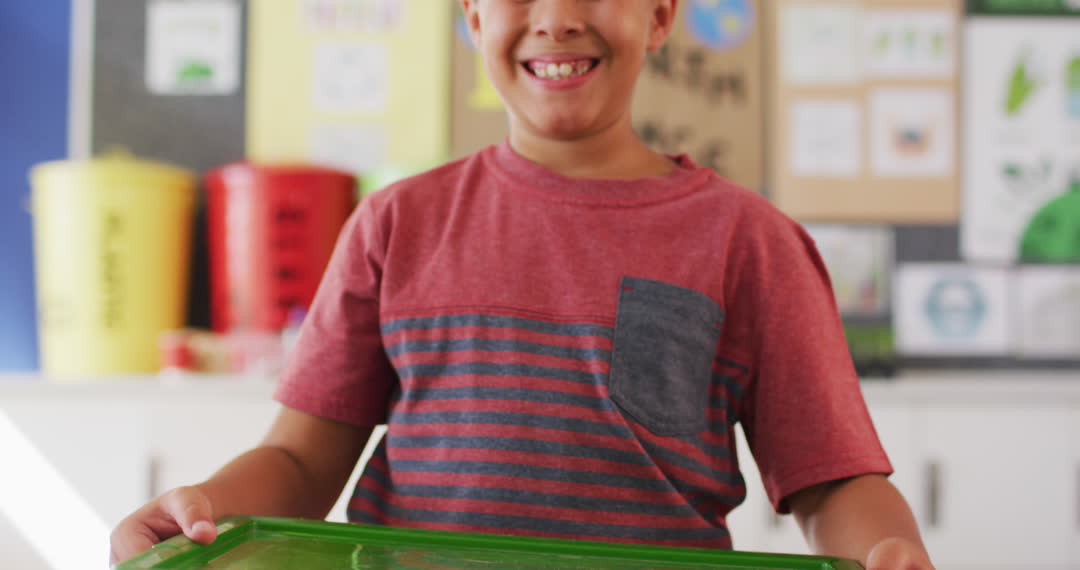 - Smiling Boy Holding Recycling Bin in School Classroom
