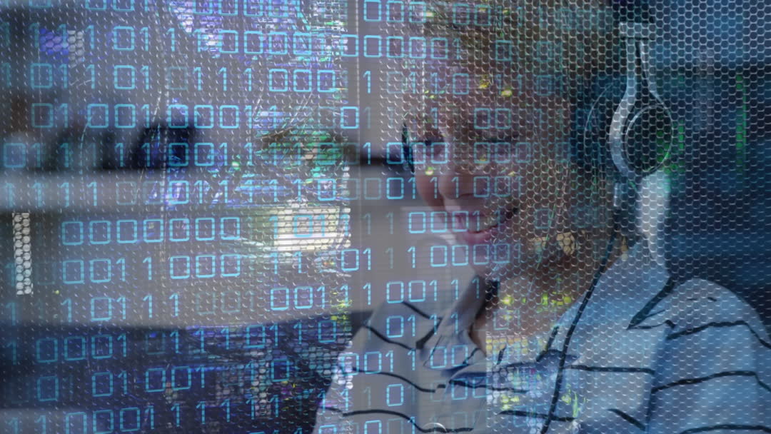 A young boy wearing headphones is engaging with coding and technology on a laptop, overlaid with binary code. This depicts the modern educational experience where digital literacy and programming skills are critical for youthful development. Perfect for illustrating concepts of digital education, innovative learning environments, childhood introduction to technology, or futuristic teaching methods.