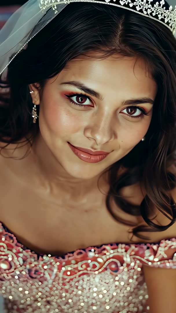 AI Generated Image. Showcasing close-up vertical motion of smiling bride holding direct gaze, delicate tiara veil, and shimmering beaded embroidered pink off-shoulder gown. Capturing warm, intimate, confident mood with soft makeup and natural skin glow, suitable for beauty and bridal storytelling. Ideal for wedding film opens, social media reels and stories, bridal boutique ads, makeup artist portfolios, invitation motion graphics, and fashion lookbooks. Offering easy color grading for warm tones, crop options for Instagram Reels and TikTok, and room for title overlays or animated text to create branded promotional content.