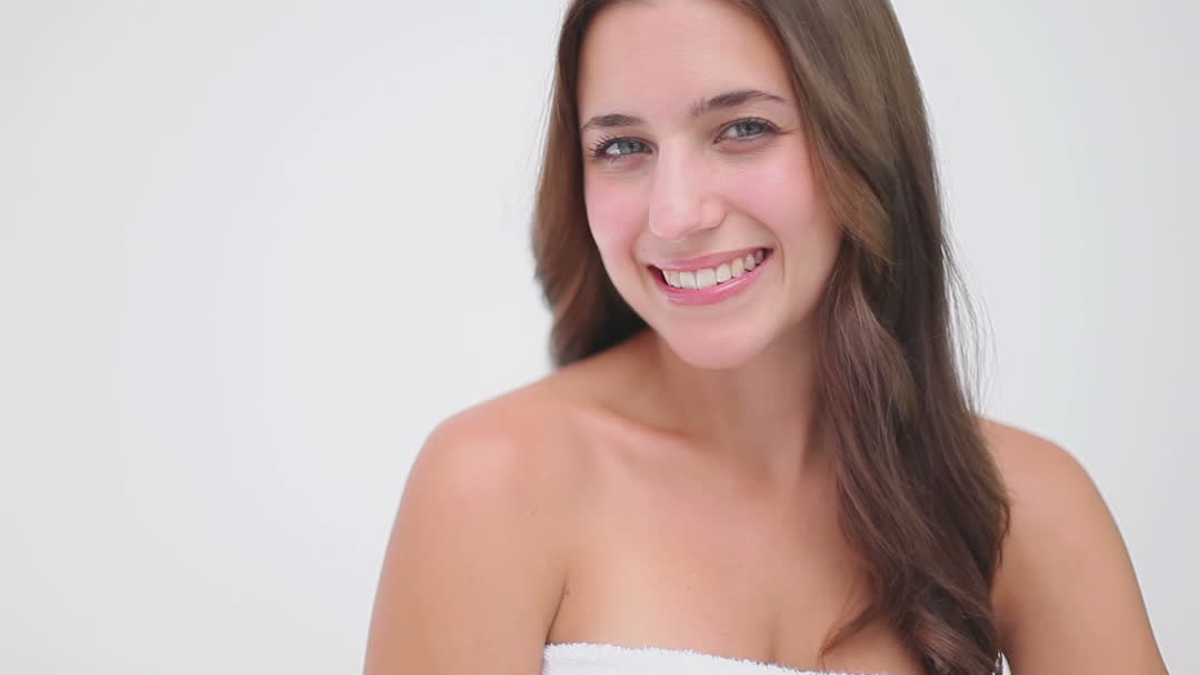 Brunette woman smiling brightly against a minimalist white background, conveying a sense of peace and relaxation. Ideal for promoting wellness and skincare products, health advertisements, and lifestyle blogs focusing on simplicity and joy.