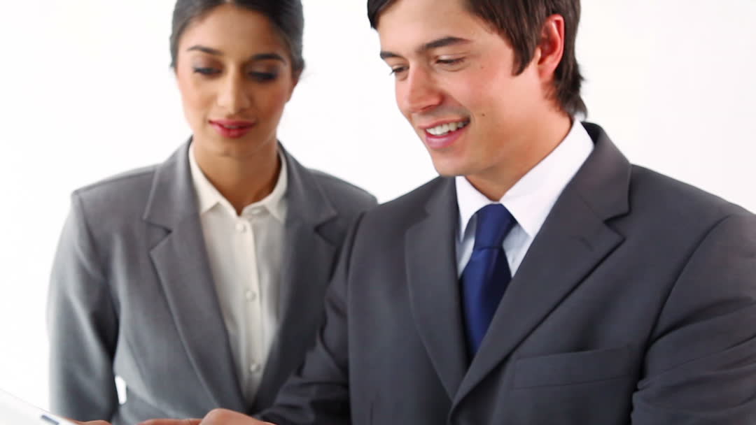 Two business professionals in formal attire engaging with a tablet, suggesting a modern workspace focused on collaboration and innovation. Suitable for illustrating teamwork, business communication, or technology in corporate settings. Useful for websites, presentations, or advertisements showcasing professional environments or cooperative technology use.