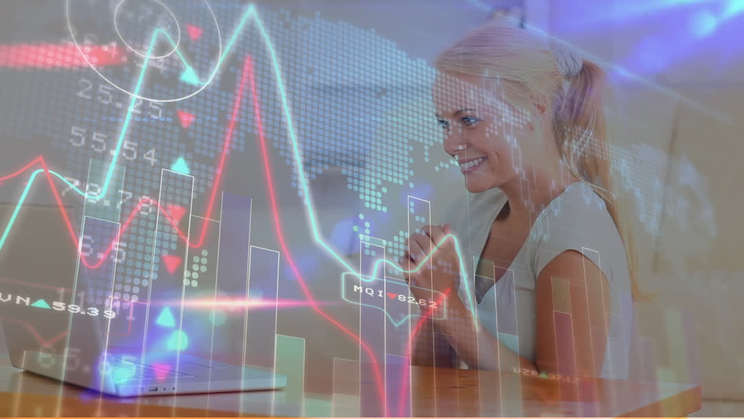 A cheerful businesswoman is analyzing financial data on her laptop with stats overlay, indicating advancements in technology-driven business environments. Ideal for illustrating themes of global finance, digital economy, technological progress, or women's roles in business sectors.