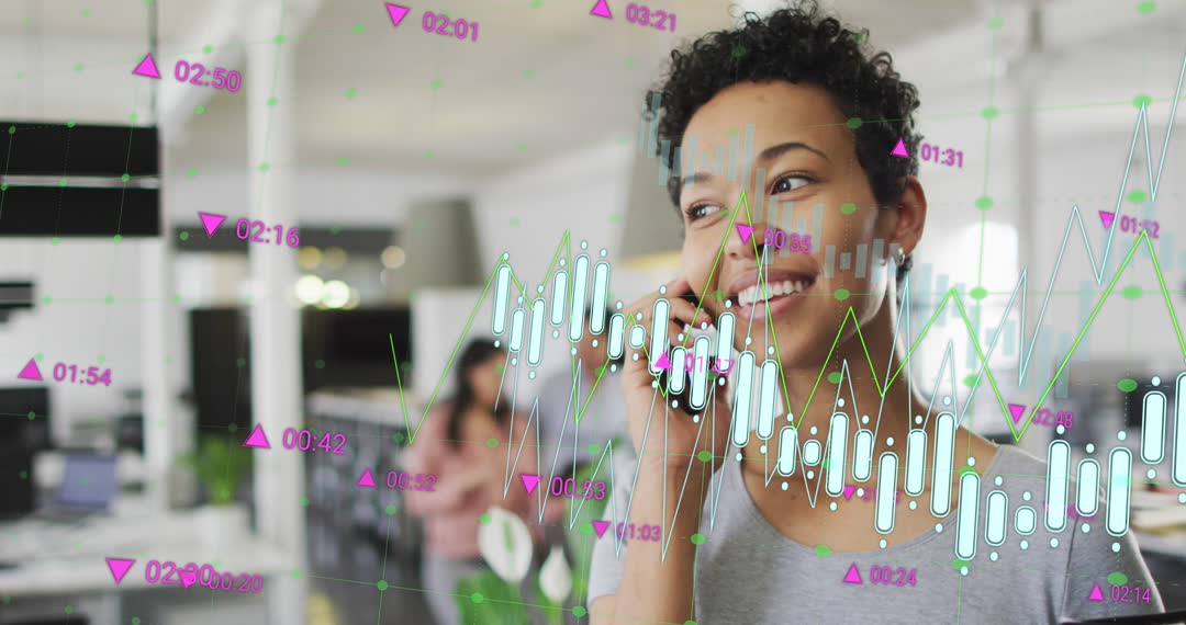 Businesswoman engaging in conversation on a smartphone while financial data and charts are superimposed. Scene combines elements of technology, finance, and communication, portraying a professional in a modern office setting. Ideal for use in projects related to digital marketing, financial consulting, and business communication illustrations.