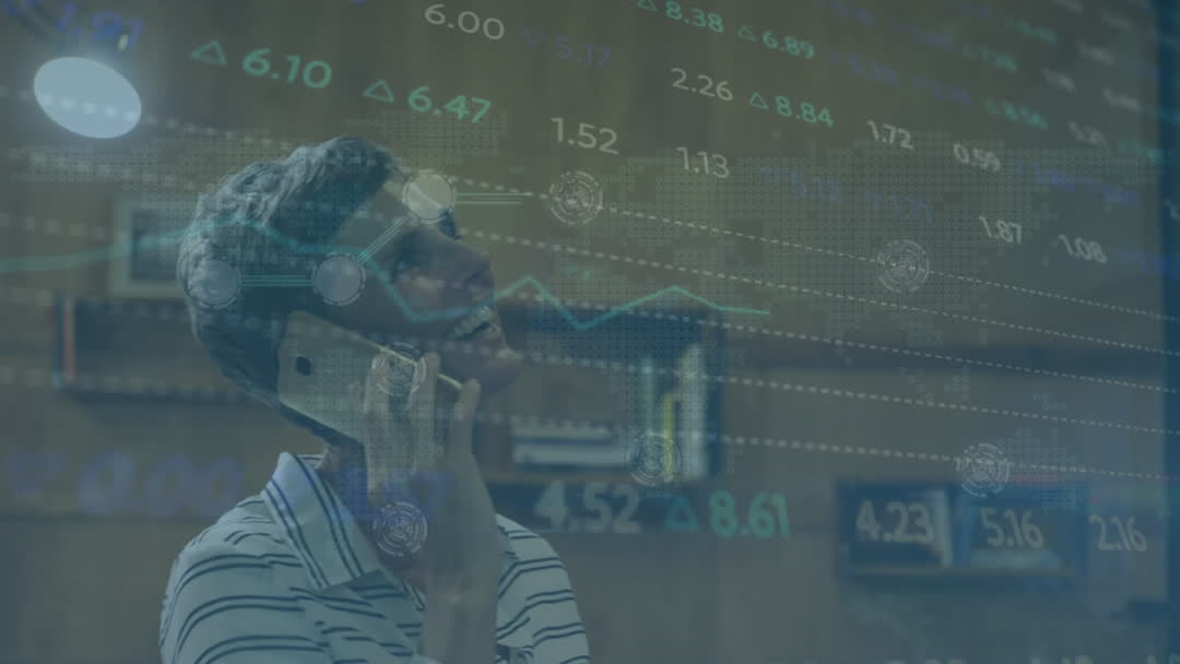The video depicts a businesswoman engaged in a phone call, with stock market data and digital elements overlaid, conveying themes of financial analysis and modern technology. This visual is useful for illustrating global business trends, finance blogs, or technology-focused content, highlighting connectivity and data interpretation.