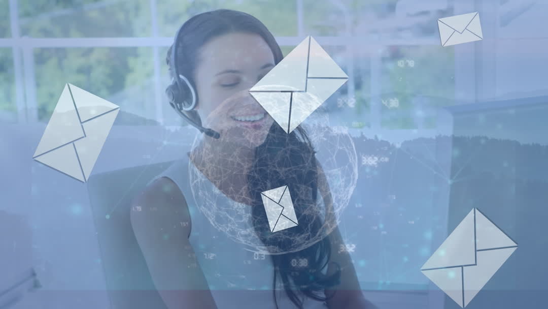 Businesswoman using phone headset while floating email icons symbolize digital communication. Overlay with abstract global connection. Useful for illustrating remote work, cloud services, virtual assistants, and online customer support themes.
