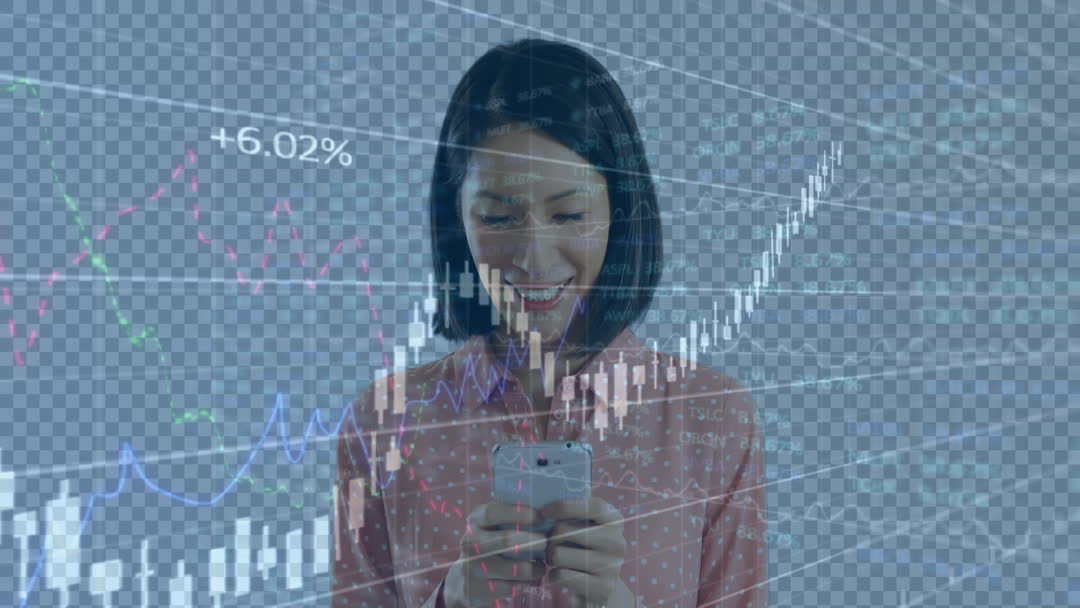 Smiling young woman holding smartphone with overlay of financial data and stock market charts captures intersection of business interaction and technology. Scene indicates innovative ways professionals utilize digital tools for financial analysis, predictive analytics, or market research. Suitable for visually emphasizing financial technology, modern business strategies, use in ads or features related to digital finance industries.