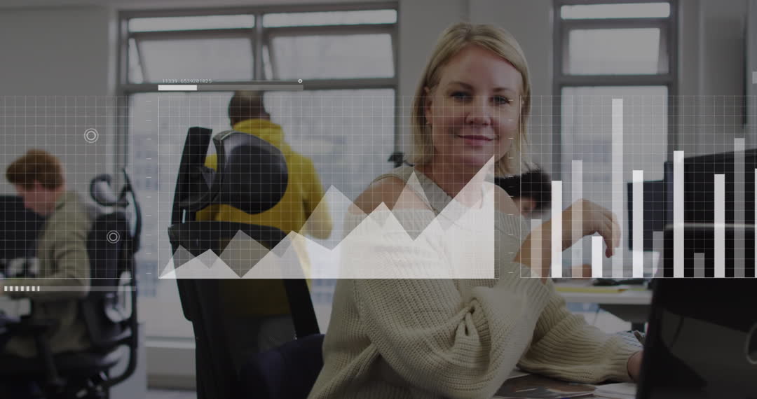 This video presents a smiling businesswoman sitting at a desk, accompanied by digital statistical data graphics overlay. The visuals of graphs and charts suggest themes of data analysis, technology adoption, and business performance review in a modern office environment. This could be ideal for illustrating corporate business articles, advertising data analytics services, or enhancing content about innovative workplace solutions.