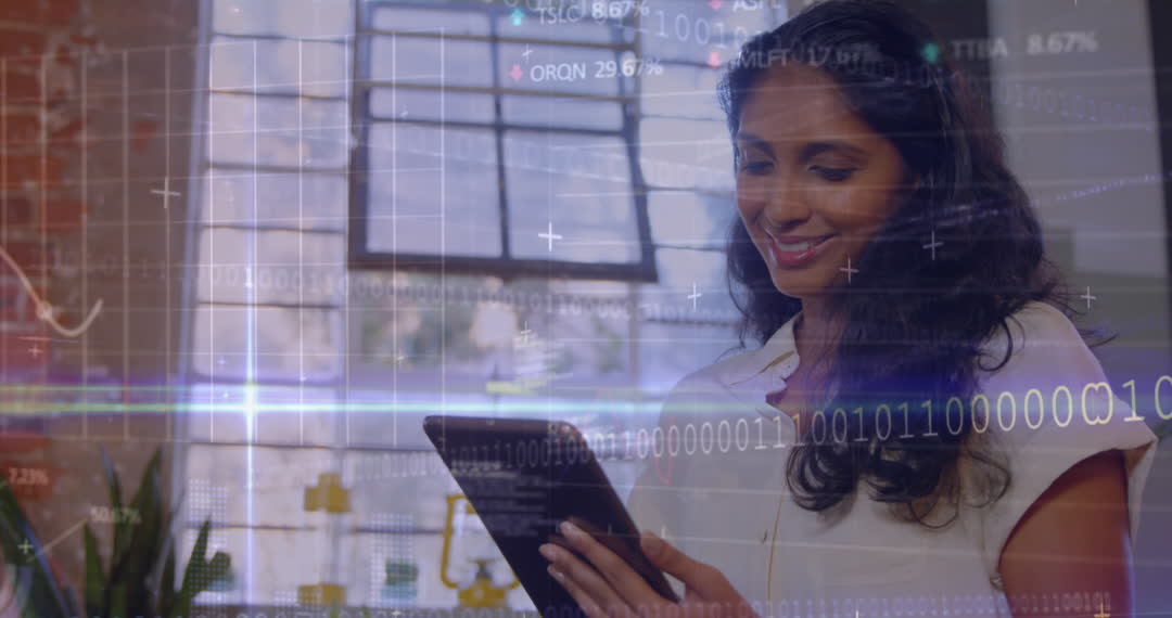 Smiling Businesswoman with Digital Financial Data Overlay Video