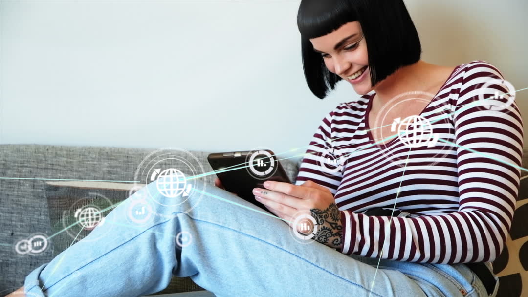 A businesswoman sits casually on a sofa smiling at her digital tablet. Various digital overlay icons like connected globes and graphs suggest network connectivity and data visualization. Suitable for concepts related to modern business, digital entrepreneur lifestyle, and offices emphasizing technology and innovation.