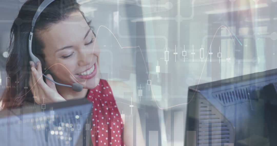 Businesswoman engaged in work while wearing a headset, overlayed with financial data charts and graphs. Ideal for illustrating concepts such as customer support, data analysis in finance, and modern office processes. Perfect for use in presentations, articles, or websites related to business communication, financial services, and technological integration.