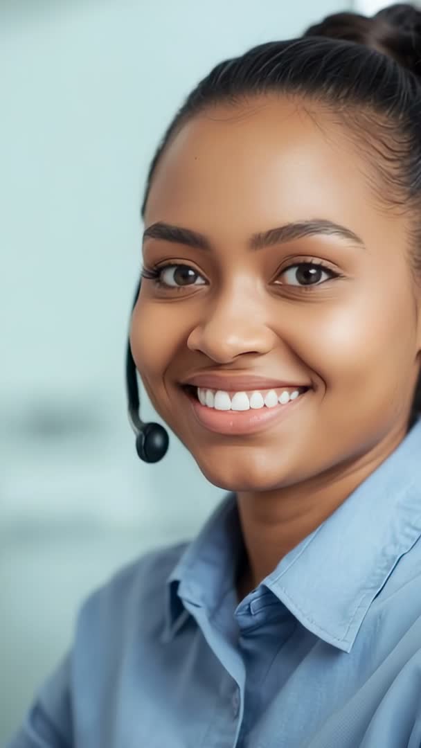 AI Generated Image. Showing friendly call center agent smiling while taking customer call with headset against blurred office background. Highlighting close-up composition, warm smile, clear eye contact, and professional attire in light-blue shirt. Serving customer support training videos, contact center websites, corporate presentations, app onboarding, social media ads, promotional content. Supporting use as thumbnail, opener clip, staff profile reel, or overlay for on-screen captions and lower thirds. Enabling brand messaging around friendly service, fast response, professional support, and customer satisfaction. Providing natural light, soft tones, modern office feel for versatile corporate and marketing projects.