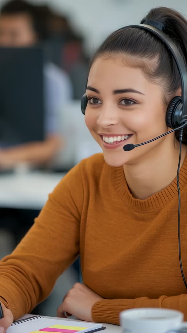 AI Generated Image. Vertical video showing smiling call center agent wearing headset, taking customer call and jotting notes at desk in open-plan office. Close-up framing highlighting friendly expression, attentive listening, clear headset microphone, hand writing on spiral notebook. Background showing blurred colleagues and computer monitors, suggesting busy customer support environment. Use for customer service training videos, website hero banners, vertical social ads, recruitment campaigns, corporate communications, contact center tutorials, technology and telecom promotions. Suitable for illustrating friendly support, remote assistance, help desk workflows, live chat escalation, onboarding and team collaboration. Color palette and warm-toned sweater creating welcoming, human-centered tone ideal for branding, UX case studies, internal training materials and social media storytelling.