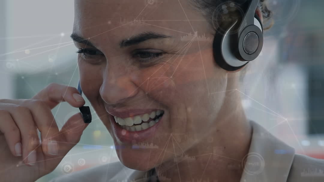 Smiling Call Center Agent with Headset and Graphical Data Overlay Video