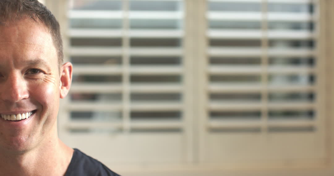 Middle-aged man smiling warmly against backdrop of bright white blinds, suggests modern professional environment. Ideal for use in promotional materials or advertisements highlighting positivity and professionalism in workplaces or laboratories.