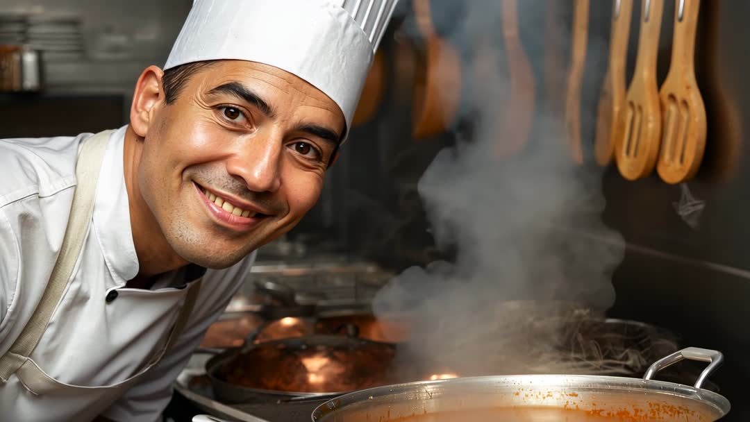 href="https://pikwizard.com/video/smiling-chef-enjoying-aroma-of-culinary-creation-in-industrial-kitchen/2155193eea174dcae9e8b4b209d194f8/"