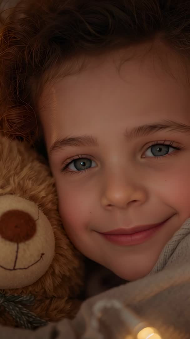 - Smiling child cuddling teddy at bedtime under soft blanket warm glow vertical video