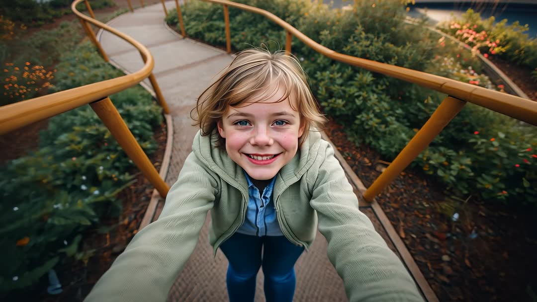 AI Generated Image. Video showing smiling child reaching toward camera while walking along curved ramp flanked by yellow handrails. Composition featuring close-up POV perspective, shallow depth of field, warm natural light and lush greenery lining pathway. Emotion conveying joy, trust and playful connection, with candid facial expression and engaging eye contact. Footage suiting family and parenting content, early childhood education, park promotion, accessibility awareness campaigns, social media reels and lifestyle ads. Clip working well as intro shot, hero banner video, testimonial scene, or montage insert for travel and outdoor activity projects. Color palette featuring soft greens and warm yellows, motion suggesting movement and connection, easy to edit into horizontal 16:9 timelines.