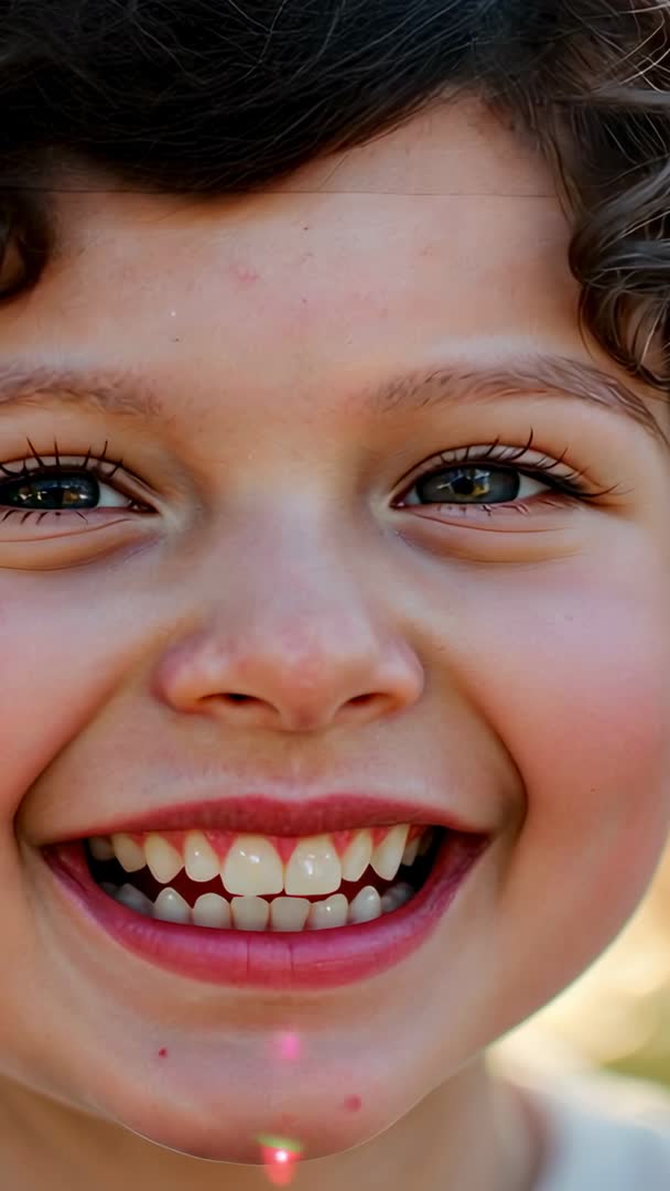 AI Generated Image. Vertical video showing smiling child reacting to camera zoom during golden hour in park. Closeup capturing bright teeth, sparkling eyes, rosy cheeks, and warm backlight with subtle lens flare. Footage conveying pure joy, playful energy, and natural childhood wonder, suitable for family and lifestyle projects. Use for parenting blog headers, pediatric dentistry promotions, social media reels and stories, vertical ad campaigns, greeting card animations, homepage hero clips, and stock video libraries; pair with upbeat music and bold captions for emotional impact.