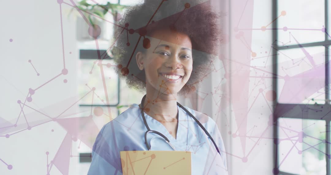 This clip features a clinician, confidently smiling and holding a folder in a modern clinical setting. Overlapping network graphics symbolize digital advancements in healthcare, innovation, and analysis. Useful for themes around healthcare technology, modern medical professions, and optimistic outlooks on future healthcare developments in videos or presentations.