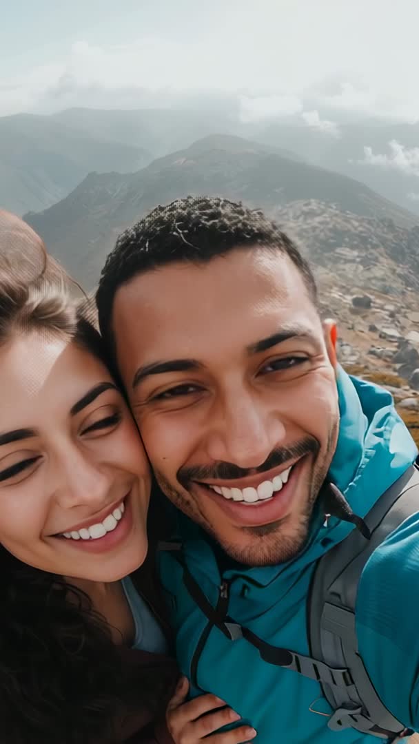 AI Generated Video. Featuring smiling couple holding phone while leaning close on alpine ridge, capturing summit selfie with panoramic mountain backdrop. Showing candid moment of joy, connection, and achievement during hiking adventure. Including vertical composition optimized for reels, stories, and mobile-first platforms. Working well for travel vlogs, outdoor gear advertising, tourism promotion, couple lifestyle content, and adventure tourism campaigns. Allowing editors to crop or extend with color grade and music for hero intro, montage, or social media ad. Suggesting usage as reel opener, blog hero banner, app onboarding visual, or promotional clip for guided hikes and expedition brands.
