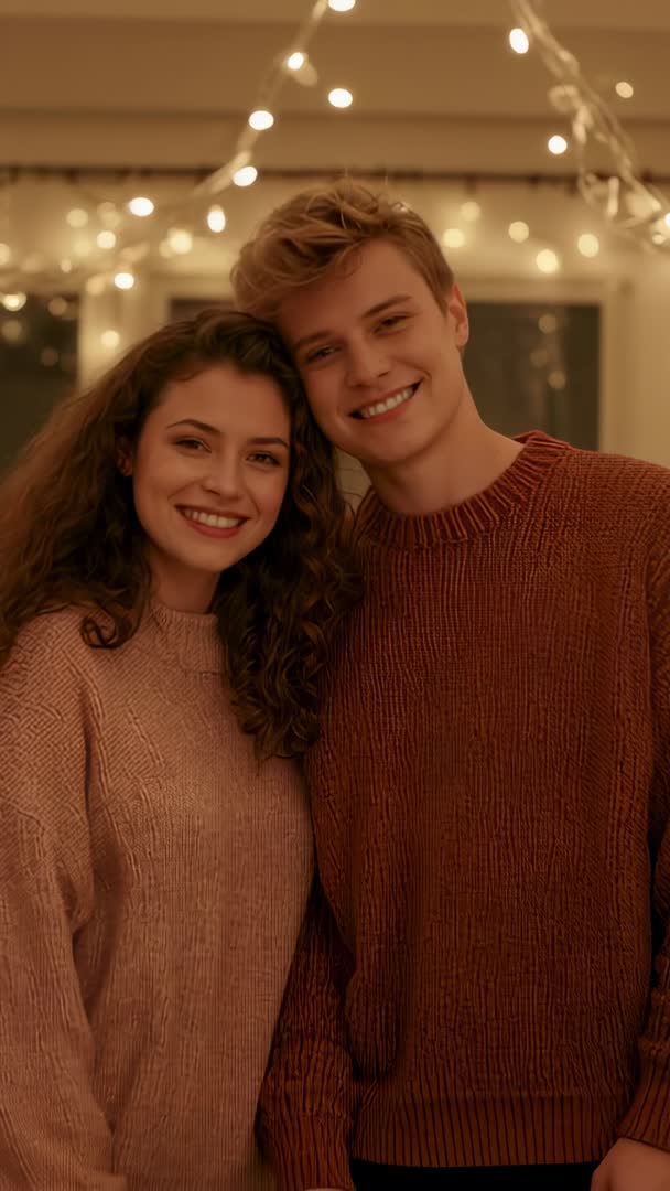 AI Generated Image. Vertical video showing young couple smiling and leaning together in cozy knit sweaters under warm string lights. Shot using close portrait framing with shallow depth of field and soft bokeh, creating intimate and tender mood. Warm amber color palette and soft highlights complement natural skin tones. Perfect for vertical social media use such as Instagram Reels, TikTok, Facebook Stories, dating app promos, lifestyle vlogs, holiday campaigns, knitwear advertisements, romantic playlists, countdowns and greeting cards. Use as hero clip for landing pages, background B-roll for relationship advice segments, or cut into short reels with acoustic guitar or mellow piano music. Pair with warm color grading and gentle camera movement to enhance connection and mood. Suitable for brands targeting young adults, couples, home decor, fashion and seasonal marketing.