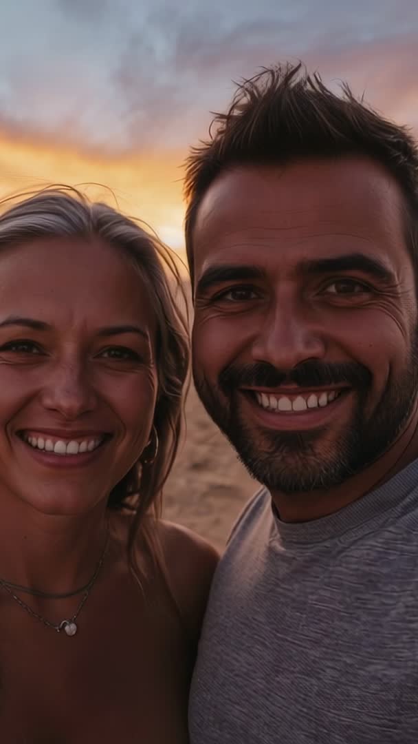 AI Generated Video. Couple smiling and taking selfie on beach dunes during sunset, close-up vertical video capturing warm golden-hour glow on faces and wind-blown hair. Pendant necklace and grey t-shirt adding subtle casual detail, background showing soft dunes and colorful dusk sky. Footage working well for social media stories, travel and lifestyle vlogs, romantic getaway promotions, dating app content, tourism ads, and relationship articles. Use as intro shot for mobile-first videos, background for promotional text overlays, or hero clip for seasonal campaigns. Color grade supporting warm, intimate mood and vertical framing suited for smartphone delivery.