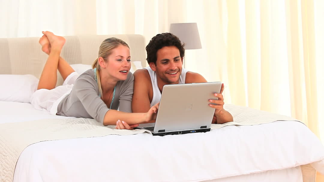 - Smiling Couple Using Laptop on Bed in Bright Room