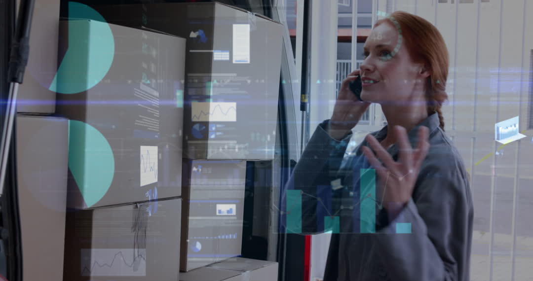 Young caucasian courier talking on a smartphone while surrounded by digital financial data animations in a warehouse environment offers themes of technology-driven logistics, communication solutions, and data-driven business operations. This video can be used in content focusing on advancements in warehouse management, the impact of technology on delivery services, or marketing materials for communication tools in the logistics industry.