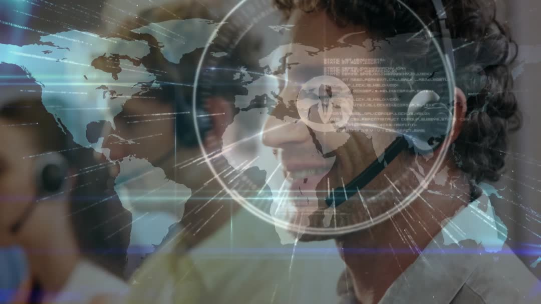 Smiling Customer Help Agent with Global Digital Interface Visualization Video