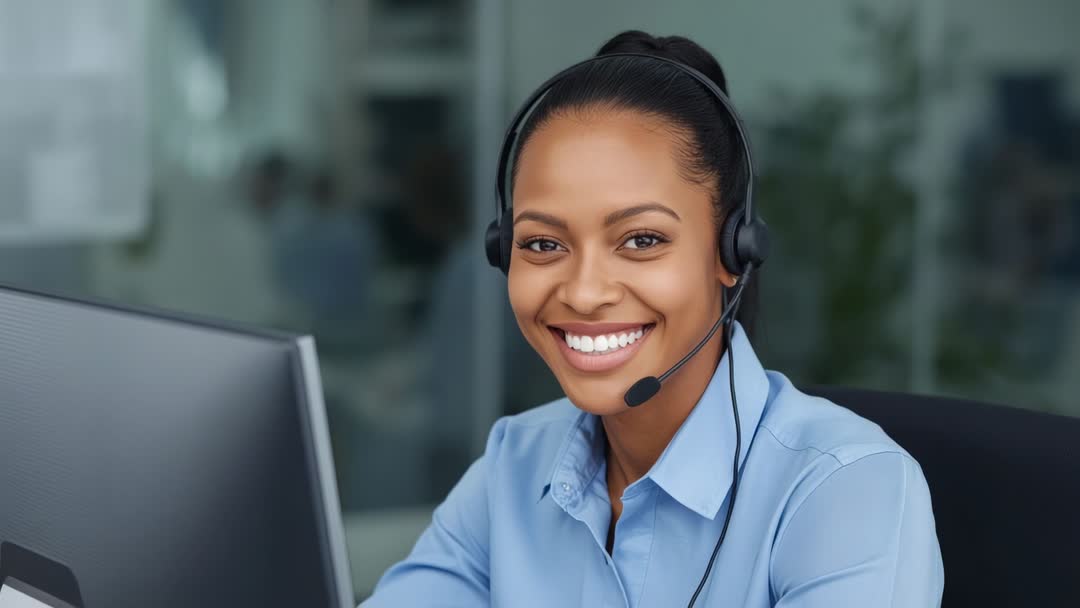 AI Generated Image. Video showing smiling customer service agent answering calls with wired headset at desk, speaking into microphone and engaging with caller. Camera focusing on friendly expression and professional demeanor, while background displaying glass partitions and blurred coworkers. Scene conveying efficient customer support, team collaboration, and modern office technology. Suitable for use in customer service training videos, contact page headers, corporate presentations, call center recruitment ads, software demos, and marketing campaigns promoting support solutions. Clip working well for subtitles, lower thirds, and overlay text to highlight service features. Color palette neutral and lighting soft, enabling easy color grading and branding.