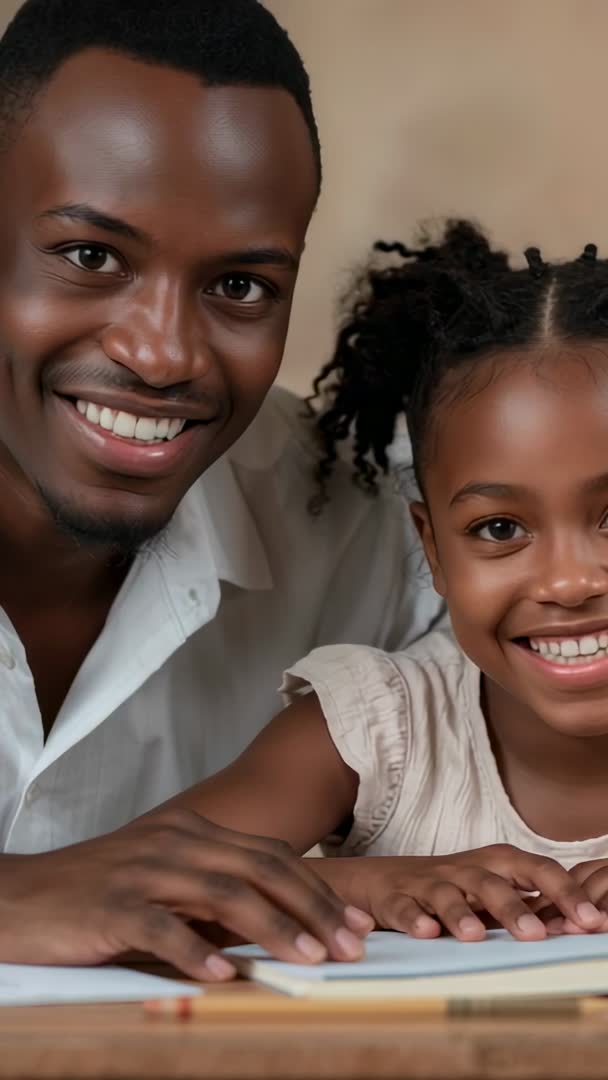 AI Generated Video. Video showing smiling dad and daughter studying together at home. Closeup framing capturing warm bonding moment during homework session. Serving well for parenting content, back-to-school campaigns, homeschooling guides, online tutoring promotions, family lifestyle blogs, social media reels, and product advertising for education tools. Footage working well as hero clip, intro sequence, or cutaway in tutorial videos. Natural lighting and genuine expressions creating friendly, trustworthy mood. Recommending editing for vertical mobile-first platforms, adding gentle music and on-screen captions, and shortening to 15-30 seconds for social ads. Useful for illustrating parent involvement, early education, study habits, and family connection.