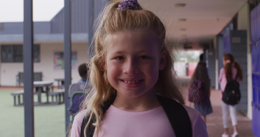 Young girl with blonde hair smiling while walking outside indicates a return to school environments post-break. Captures joyful essence of youth, perfect for use in educational materials, back-to-school promotions, or discussions on childhood learning experiences.