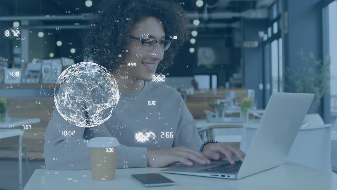 A smiling entrepreneur analyzes global business data on a laptop, with a digital globe overlaying emphasizing connectivity. Ideal for promoting technology services, remote work solutions, or showcasing innovation in modern businesses and startup culture.