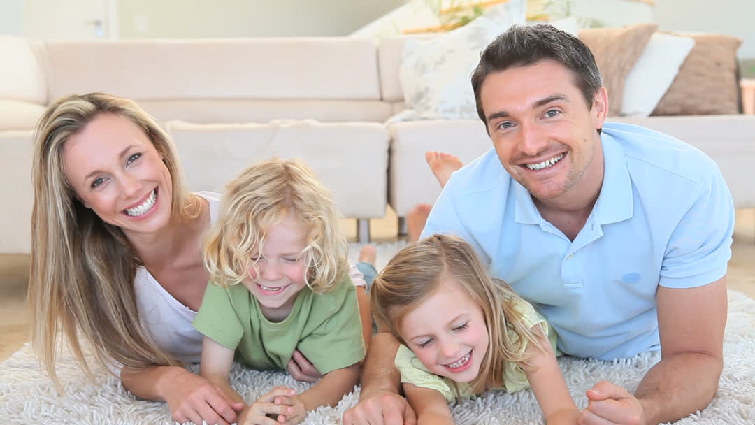 - Smiling Family Relaxing Together on Carpet Home