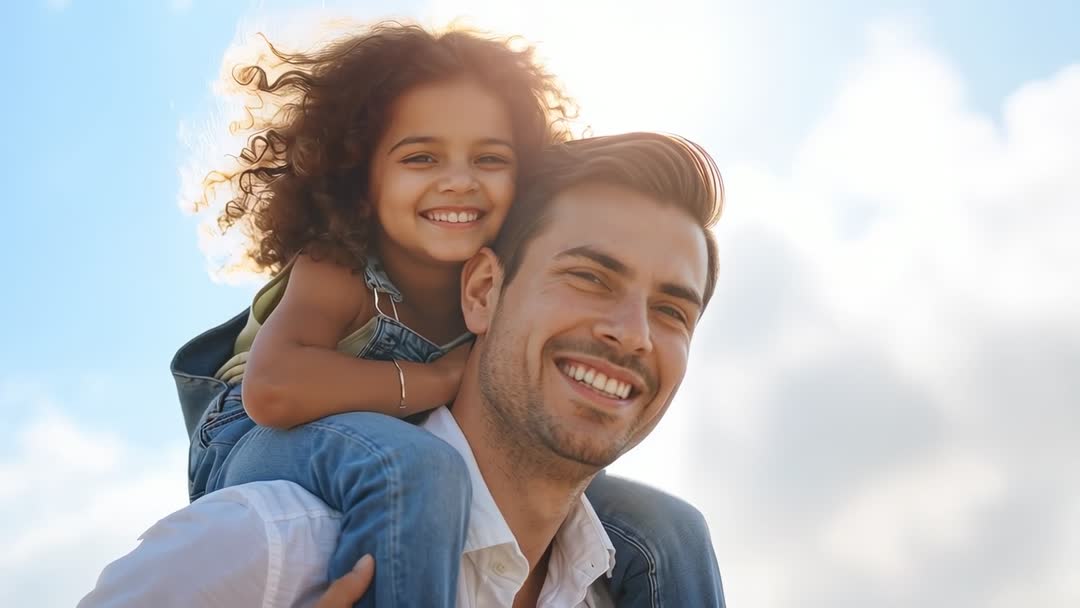 AI Generated Video. Smiling father carrying daughter on shoulders during sunlit outdoor outing, backlight creating warm halo around curly hair. Scene presenting joyful family bond, carefree childhood, and active fatherhood. Serving parenting blog banners, Father's Day campaigns, family travel promos, health and life insurance ads, social media content, hero website imagery, and editorial features on modern parenting. Clip working well as opening shot for family lifestyle videos, commercial spots, and emotional brand storytelling. Color palette offering warm golden tones and natural sky background, fitting summer and weekend themes. Composition allowing cropping for horizontal or square formats, enabling overlaying of text and logos without losing subject focus.