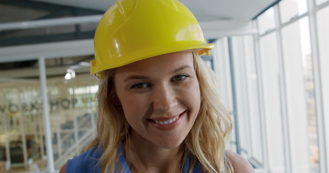 This video presents a young professional architect wearing a yellow hard hat in a modern office space, conveying a sense of confidence and approachability. It's perfect for use in workplace diversity materials, promoting women in architecture or construction, and corporate marketing campaigns. The bright window background highlights the modern architectural environment.
