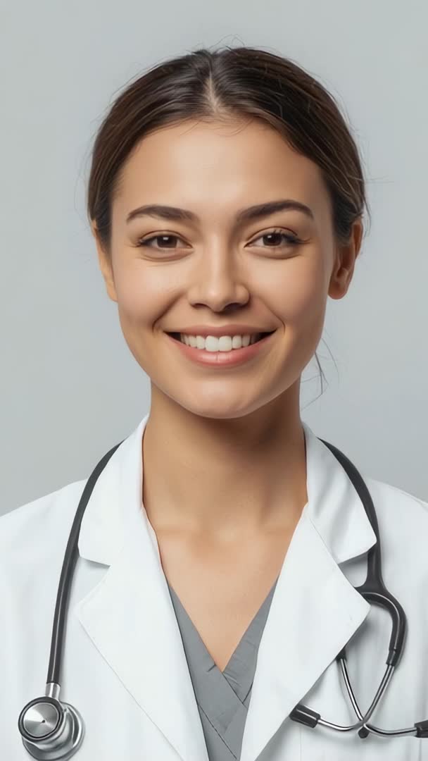 AI Generated Image. Vertical video clip featuring smiling female clinician reacting to on-screen prompt with natural blink and warm approachable smile while wearing lab coat and stethoscope against neutral studio background. Close-up framing and steady camera movement creating intimate, human-first moment suitable for mobile-first playback. Use for telemedicine promos, appointment reminder clips, patient education videos, staff recruitment ads, social media reels, website hero banners, and corporate healthcare presentations. Edit tips: loop-friendly short take, add captions or voiceover for message clarity, crop for Instagram Reels or TikTok, and pair with upbeat background music for welcoming tone.