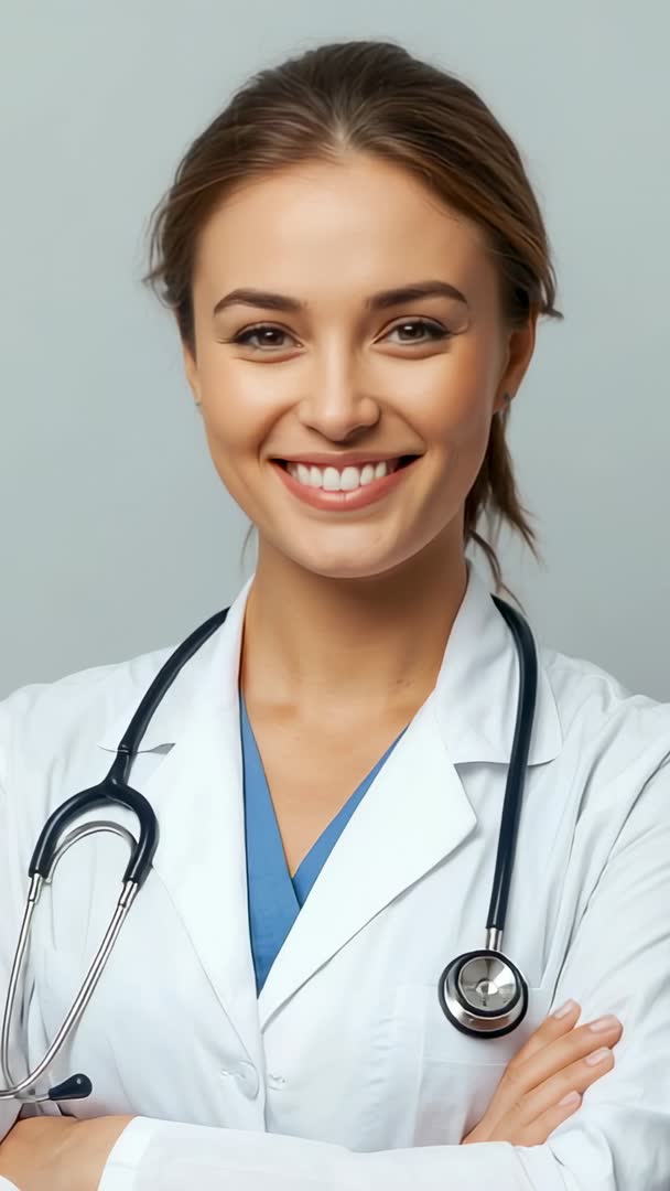 AI Generated Video. Vertical video showing smiling female doctor wearing white lab coat and blue scrubs, stethoscope around neck, folding arms while facing camera against neutral gray background. Portrait framing from chest up, soft even lighting enhancing warm skin tones, expression conveying approachability and confidence. Footage conveying trust, professionalism, and patient-centered care. Ideal for healthcare websites, clinic social media posts, telehealth landing pages, patient education content, staff recruitment campaigns, medical training videos, wellness and preventive care promotions, online ads and vertical video platforms. Suggested uses include hero banner for mobile site, Instagram Stories and Reels, TikTok health campaigns, YouTube short clips, telemedicine intro, staff profile video, corporate presentation slide with overlay text. Color palette neutral with white coat and blue scrubs allowing easy text overlay and branding. Clean background enabling seamless cropping and caption placement.