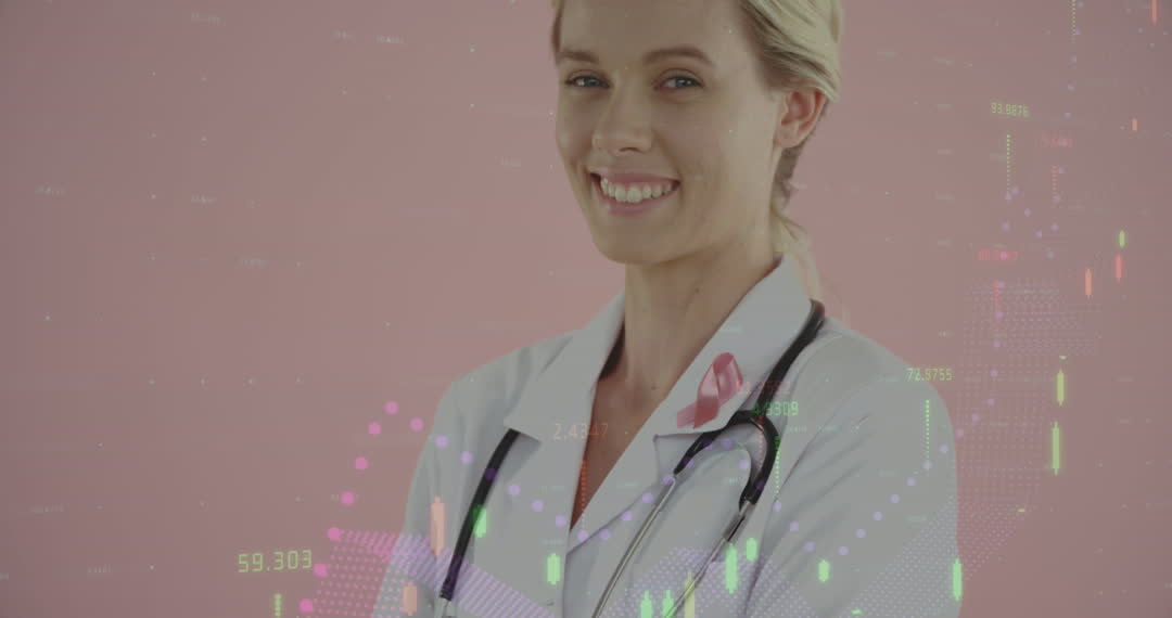 Female doctor wearing white coat with stethoscope standing against a pink background is overlayed with digital data visuals and graphs. Perfect for conveying intersection of healthcare and technology discussions, promotional materials for medical tech advancements, or educational use in explaining data-driven health solutions.