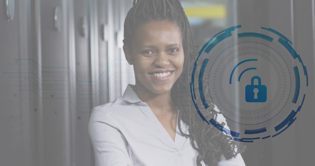 - Smiling Female Engineer in Data Center with Padlock Graphic Overlay